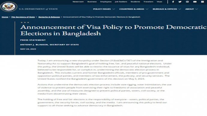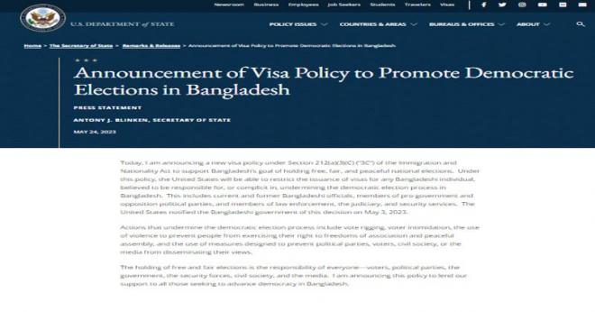 অবাধ ও সুষ্ঠু নির্বাচন নিশ্চিতে বাংলাদেশের জন্য আলাদাভাবে ভিসা নীতি ঘোষণা করেছে যুক্তরাষ্ট্র। স্টেট ডিপার্টমেন্টের প্রেস স্টেটমেন্টে মার্কিন পররাষ্ট্রমন্ত্রী অ্যান্থনি জে ব্লিঙ্কেনের বক্তব্য তুলে ধরা হয়েছে।