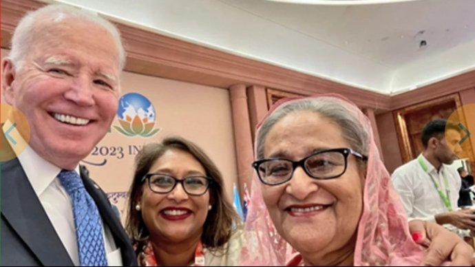 ভারতের নয়াদিল্লিতে জি-২০ সম্মেলনে প্রধানমন্ত্রী শেখ হাসিনা ও তার মেয়ে সায়মা ওয়াজেদ পুতুলকে সঙ্গে সেলফি তুলেছেন যুক্তরাষ্ট্রের প্রেসিডেন্ট জো বাইডেন। এসময় পাশে পররাষ্ট্রমন্ত্রী এ কে আবদুল মোমেনকে দাঁড়িয়ে থাকতে দেখা যায়।