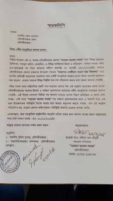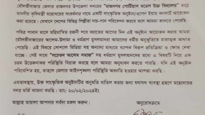 জেলা প্রশাসকের কাছে প্রেরিত ওই স্মারকলিপির লিখিত বক্তব্যে তারা বলেন- আমরা মৌলভীবাজার জেলার ‘সচেতন আলেম সমাজ’- যারা বিভিন্ন মাদ্রাসার প্রিন্সিপাল, শায়খুল হাদিস, মোহাদ্দিস ও বিভিন্ন মসজিদের ইমাম ও খতিব। আমরা অত্যন্ত গভীর দুঃখ-ভারাক্রান্ত মন নিয়ে আপনার সমীপে জানাচ্ছি ২৪ শে ফেব্রুয়ারি মৌলভীবাজার জেলার রাজনগর উপজেলা সদরের ‘রাজনগর পোর্টিয়াস মডেল উচ্চ বিদ্যালয়’ মাঠে কৃষিমন্ত্রীর সংবর্ধনার নামে একটি সাংস্কৃতিক অনুষ্ঠান ওপেন ইয়ার কনসার্ট আয়োজন করা হয়েছে। যেখানে দেশের বিভিন্ন শিল্পীরা নাচ-গান পরিবেশন করবে বলে আমরা জানতে পেরেছি।