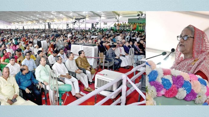 শেখ হাসিনা বলেন, ৭৫ সালে জাতির পিতাকে হত্যার পর সে সময় প্রবাসে থাকায় তাঁকে এবং শেখ রেহানাকে অবৈধভাবে সংবিধান লংঘন করে ক্ষমতা দলকারীরা দেশে ফিরতে দেয়নি। তাঁরা প্রবাসে রিফিউজি হিসেবে জীবন কাটাতে বাধ্য হন এবং ’৮১ সালে আওয়ামী লীগের কাউন্সিলে তাঁকে সভাপতি নির্বাচিত করার পর একরকম জোর করে তাঁর দেশে ফেরা। তিনি এমন একটা সময় দেশে ফিরেছিলেন যখন যুদ্ধাপরাধী এবং জাতির পিতার খুনিরা ক্ষমতায়। জিয়া ইনডেমনিটি অর্ডিন্যান্স জারি করে জাতির পিতা হত্যার বিচারের পথ রুদ্ধ করে খুনিদের বিদেশে বিভিন্ন দূতাবাসে চাকরি দিয়ে পুরস্কৃত করেন। শেখ হাসিনা বলেন, আমি এসেছিলাম একটা চিন্তা নিয়ে যে এদেশের মানুষের ভাগ্য পরিবর্তন করতেই হবে। মানুষকে সুখী সমৃদ্ধ জীবন উপহার দিতে হবে। ২০২০ সালের জাতির পিতা জন্মশতবার্ষিকী এবং ২০২১ সালে স্বাধীনতার সুবর্ণ জয়ন্তী উদযাপনকালেই বাংলাদেশ স্বল্পোন্নত দেশ থেকে উন্নয়নশীল দেশের স্বীকৃতি লাভ করে যা ২০২৬ সাল থেকে কার্যকর হওয়া শুরু হবে। সেজন্য যথাযথ প্রস্তুতিও নেওয়া হয়েছে। পাশাপাশি ২০০৮ সালের নির্বাচনে তাঁর দল যে দিন বদলের সনদ ঘোষণা করেছিল তার সফল বাস্তবায়নে আজ প্রকৃতই দিন বদল হয়েছে। এখন আমাদের লক্ষ্য ২০৪১ সালের বাংলাদেশ হবে স্মার্ট বাংলাদেশ। আর আগামী প্রজন্মকে সুন্দর জীবন উপহার দেওয়ার লক্ষ্যে ‘ডেল্টা প্ল্যান-২১০০’ প্রণয়ন ও বাস্তবায়নের উদ্যোগ নেওয়া হয়েছে।