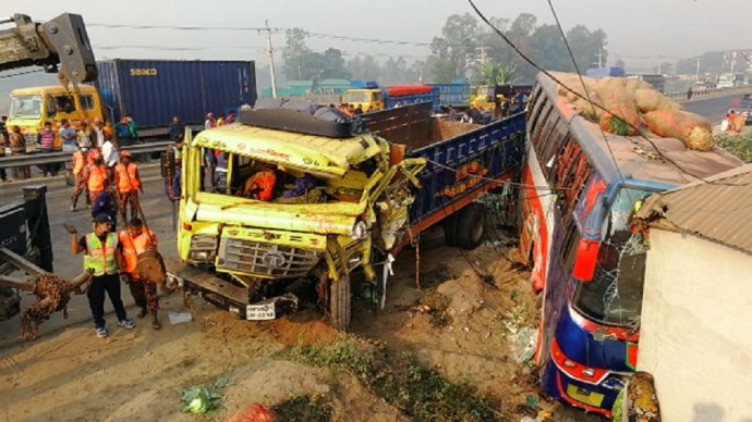 এর মধ্যে হঠাৎ করেই পেছন থেকে ঢাকাগামী সবজিভর্তি একটি ট্রাক বাসটিকে ধাক্কা মারে। এতে ঘটনাস্থলেই চারজন নিহত হন। পরে হাসপাতালে নেয়া হলে আরো দুজনের মৃত্যু হয়। সব মিলিয়ে ছয় জন নিহত হয়। আহত হয়েছে আরো অনেকে। আহতদের উদ্ধার করে স্থানীয় হাসপাতালে ভর্তি করা হয়।